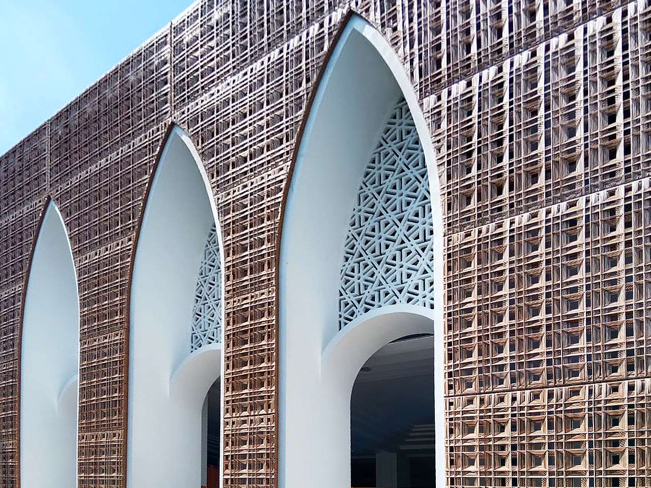 The defining visual and functional triumph of the mosque is its extensive use of Lombok-style weaving throughout the facade. This weaving is not merely decorative; it is an architectural "breathable wall" crafted from synthetic rattan to ensure long-term durability in the tropical heat. By integrating Sasak weaving motifs directly into the building's skin, the architects have created a modern interpretation of ancient textile traditions. These woven panels transform the mosque’s exterior into a textured, semi-transparent screen that pays homage to the island’s craftsmanship while serving as a bridge between the spiritual space inside and the community outside.